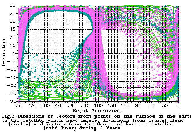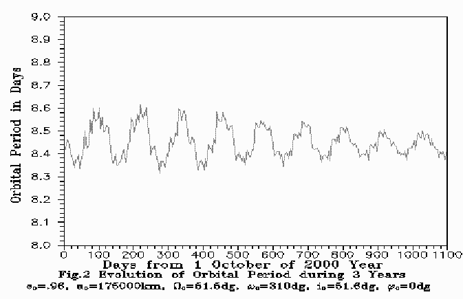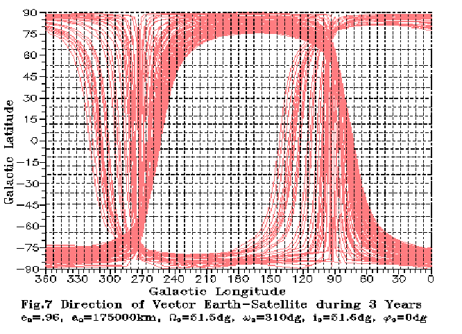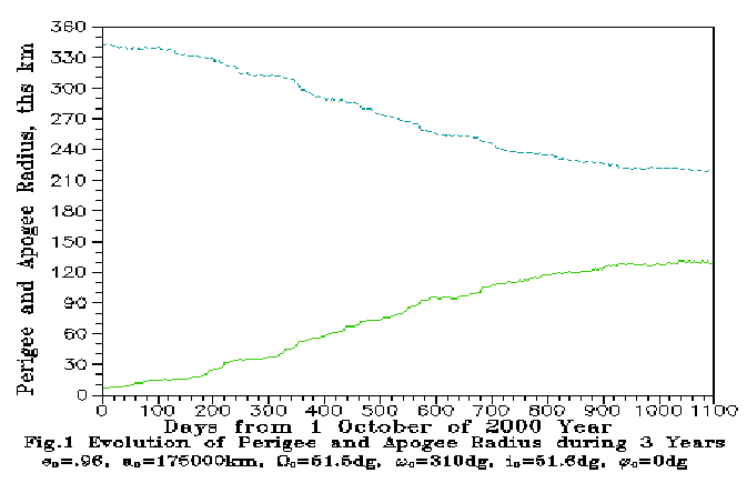 As seen on the Figures, the initial perigee is located close to the South Galactic pole. In the first year the orbit evolution is mostly in the rotation of the orbital plane by 60 degrees around a practically stationary line of apsides. The radius of the perigee is increasing from Rp=7000.0 km to 53670 km, and the radius of apogee is decreased from Ra=343000.0 km to 297460 km. During the second year the orbital plane is rotating by 10 degrees, and the line of apsides is rotating by 15 degrees. The perigee radius reaches 110832 km, and during the third year the perigee radius continues to increase to 130000 km, and the apogee radius decreases to 220000 km, then begins to increase again. The orbital plane is rotating by 6 degrees, and the perigee is rotating by 40 degrees in direction of the South Earth pole.