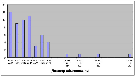 диаметру объектива (гистограмма не включает 6-метровый телескоп БТА САО РАН).