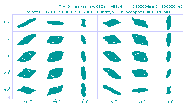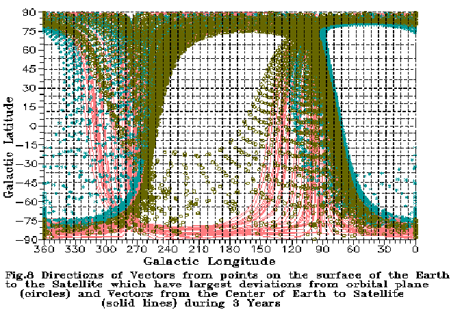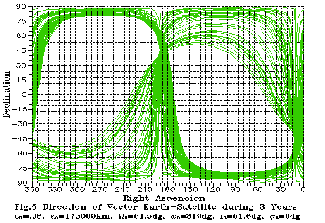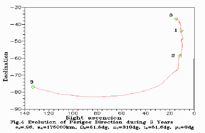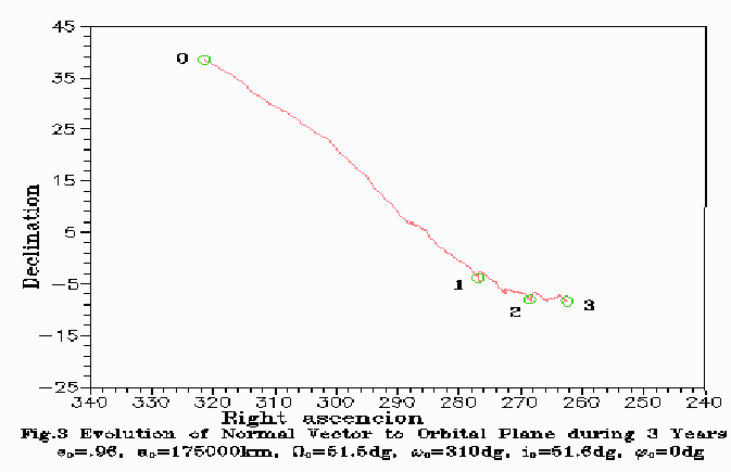 As seen on the Figures, the initial perigee is located close to the South Galactic pole. In the first year the orbit evolution is mostly in the rotation of the orbital plane by 60 degrees around a practically stationary line of apsides. The radius of the perigee is increasing from Rp=7000.0 km to 53670 km, and the radius of apogee is decreased from Ra=343000.0 km to 297460 km. During the second year the orbital plane is rotating by 10 degrees, and the line of apsides is rotating by 15 degrees. The perigee radius reaches 110832 km, and during the third year the perigee radius continues to increase to 130000 km, and the apogee radius decreases to 220000 km, then begins to increase again. The orbital plane is rotating by 6 degrees, and the perigee is rotating by 40 degrees in direction of the South Earth pole.